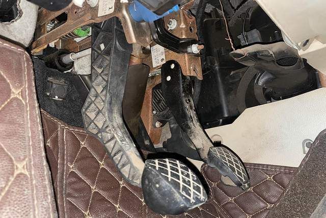 低头看了一眼主驾驶坐脚底,锈迹斑斑,第一眼看到这里大家是不是都会认为这是水泡车?毕竟这么多的锈迹,其实三金第一眼看到这里也有这样的怀疑,但我们作为一个严谨的检测师是不会这样草率下结论的,分析问题要多方面去考虑,总之这台车经过三金的仔细检查确定并非水淹车。那这里的锈迹三金分析八成是洗车时脚垫没晒干就放车里了或是其他什么情况。再看看座椅底部固定螺丝,没有拆装痕迹。